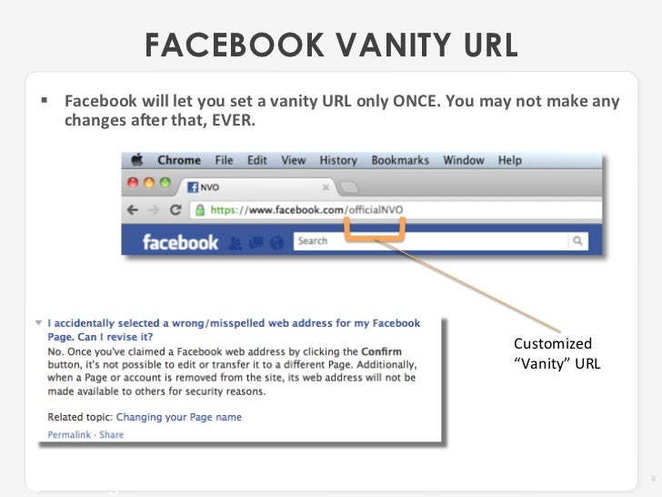 On the off chance that you coordinate your Facebook vanity URL with the page's title you are going to fortify your image acknowledgment. Additionally, personalization will gigantically enhance the findability of your page both in Facebook seek and in web indexes.